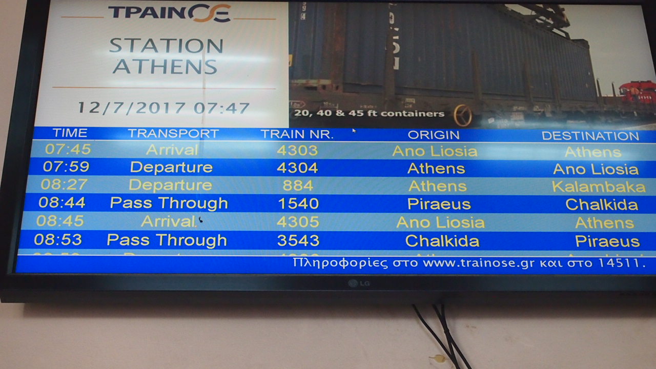 アテネ中央駅の電光掲示板には行先と時間しか表示されず、何番ホームから電車が発車するか分かりませんでした。なので駅員らしい人に聞きました。